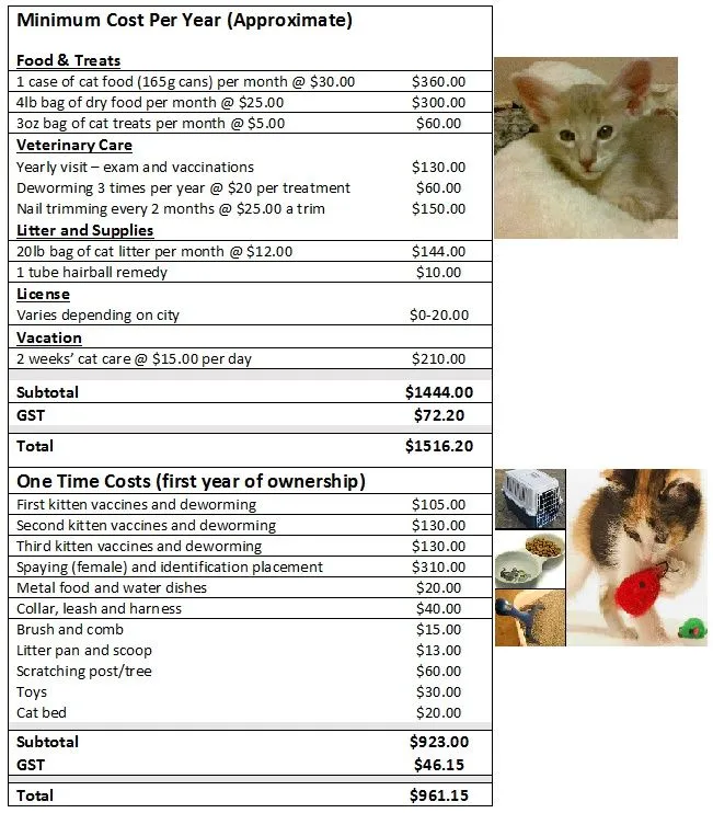 Below is an estimated cost for owning a spayed female 12 pound domestic longhair cat. (Please note emergency medical care and replacement of supplies is not included as this varies greatly)
